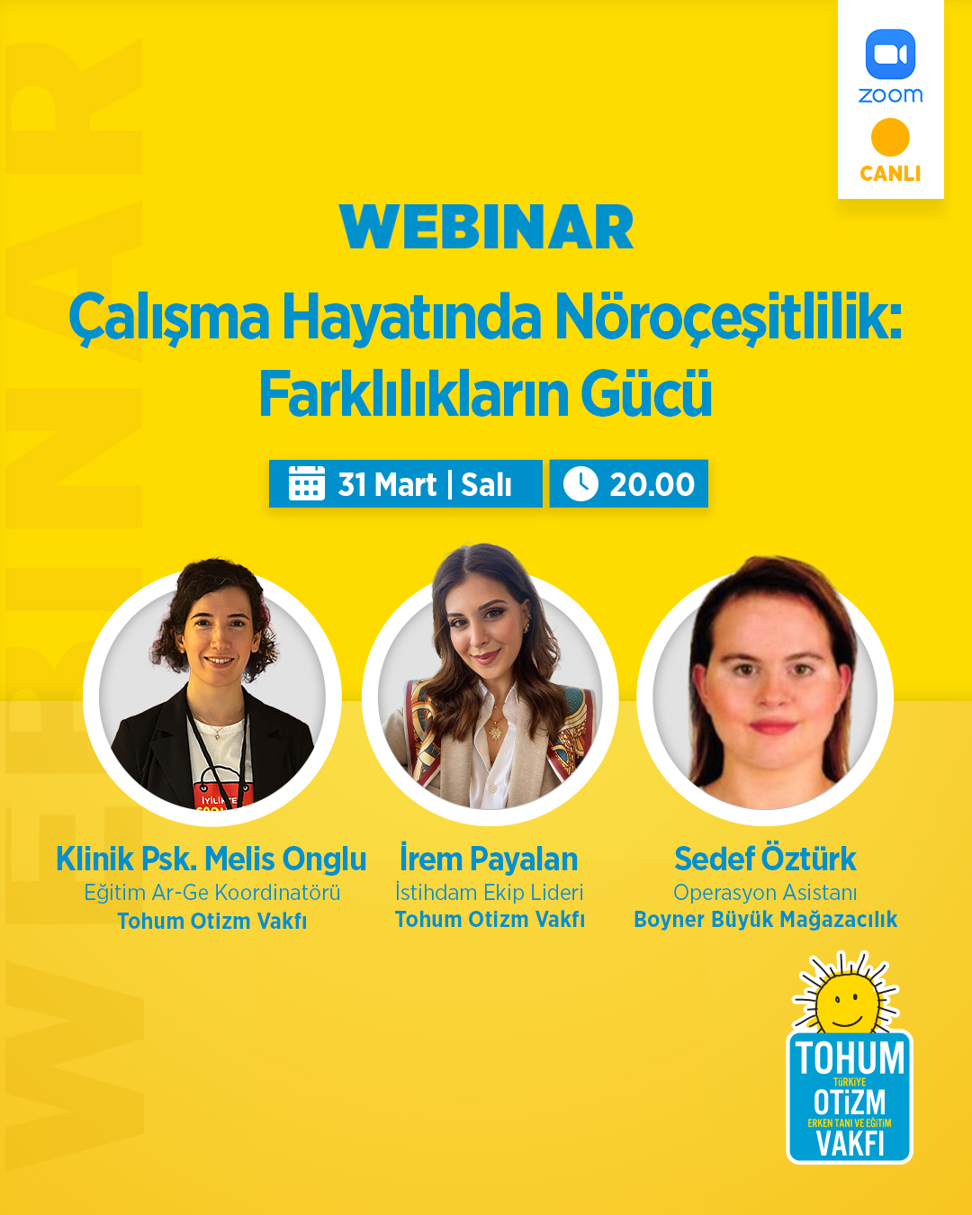 Değerli Tohum Otizm Vakfı Eğitim Portalı kullanıcıları, 31 Mart saat 20:00’da gerçekleştireceğimiz webinarımıza aşağıdaki link üzerinden kayıt yaptırabilirsiniz.